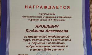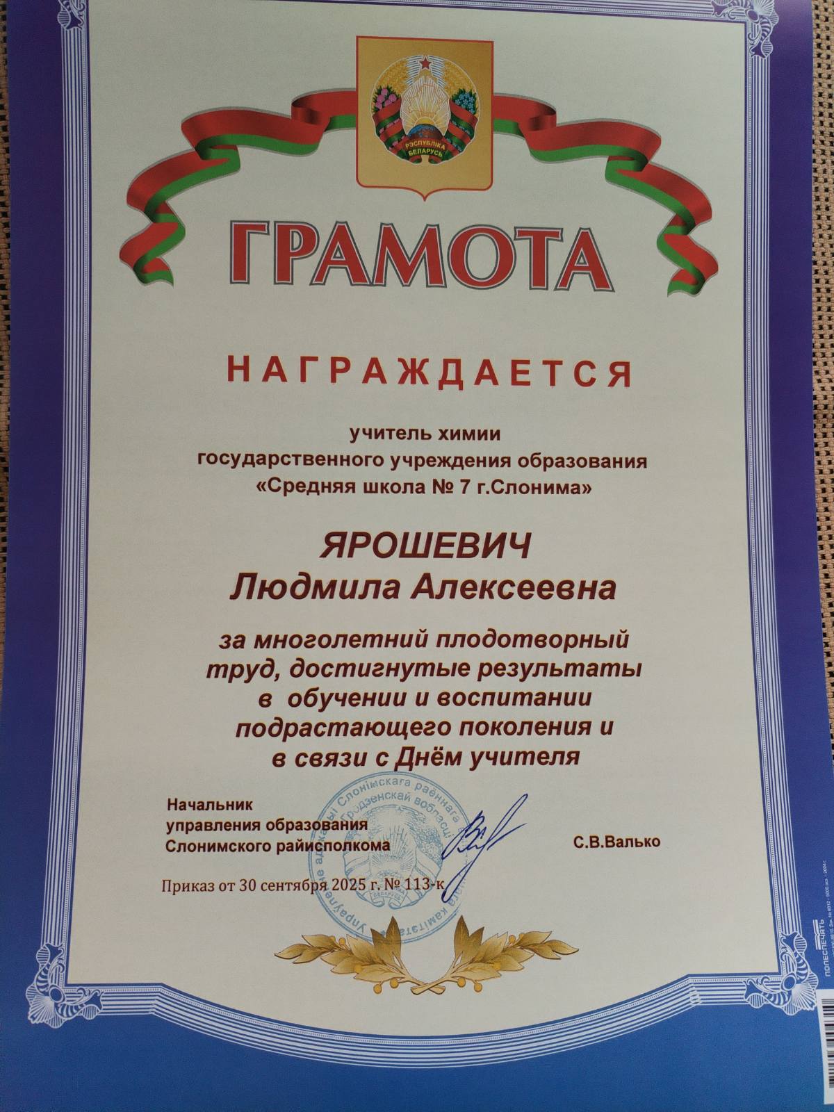 Сердечно поздравляем учителя химии Ярошевич Людмилу Алексеевну с заслуженной наградой - грамотой управления образования Слонимского райисполкома, которая была вручена на торжественном мероприятии, посвященном Дню учителя. Поздравления педагоги принимали также от куратора учреждения образования, методиста УО "Слонимский районный учебно-методический кабинет" Ботько Нины Ивановны.