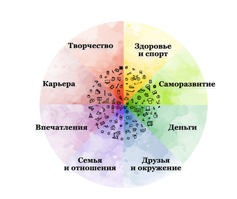 Распределение ценностей по сферам жизни поможет точнее определить личное “колесо жизни”. Это психологический тест, в виде колеса, наглядно демонстрирующий уровень удовлетворенности жизнью по 6–8 сферам. Нужно определить удовлетворенность по каждой сфере и на шкале от 0 до 10 поставить точку, соответствующую твоей оценке. После соединения таких точек по всем сферам получается подобие колеса. Чем больше это похоже на колесо, тем лучше баланс между сферами жизни. Если какие-то сферы у тебя провалились и к ним относятся выявленные ценности, то эти сферы нужно прокачивать в первую очередь.