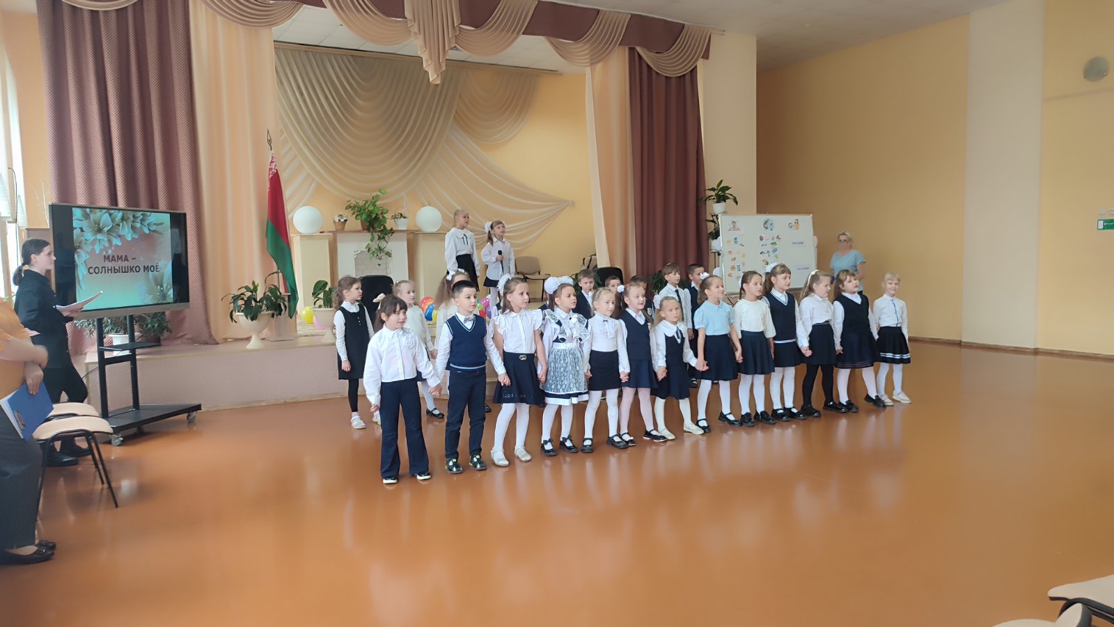 В течение дня на переменах демонстрировались видеоролики, посвященные мамам, прошли классные часы, акция "Поздравим маму вместе", а в завершение дня прошел праздничный концерт посвященный празднику. В актовом зале собрались мамы, бабушки наших детей, которые принимали участие в конкурсах, флешмобе, а дети дарили свои родным мамам замечательные песни, видеопозравления.